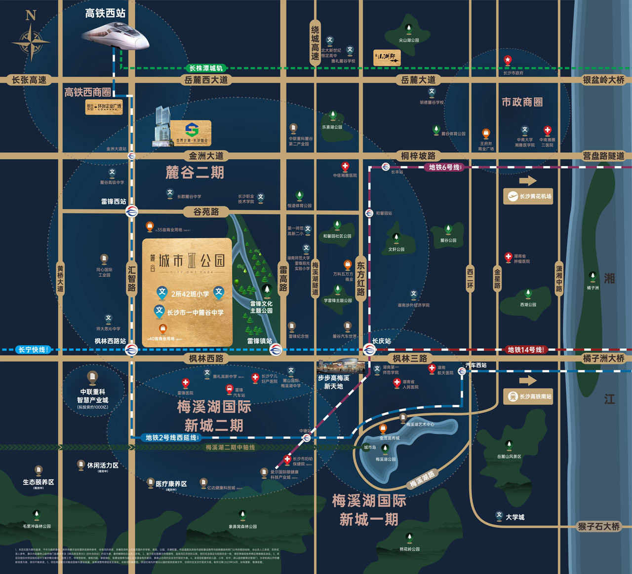麓谷城市公园位于湘江新区枫林西路与汇智路交汇处,麓谷核芯;项目自建幼儿园(规划)及两所42班小学(规划),家门口的长沙市一中麓谷中学(规划),实现目送式上学;与梅溪湖步步高新天地直线距离约2KM,逛街购物十分方便;举步即达地铁2号线延长线枫林西路站(在建)和雷锋西站(在建);悠居雷锋河湿地公园(规划),散步休闲十分舒适。